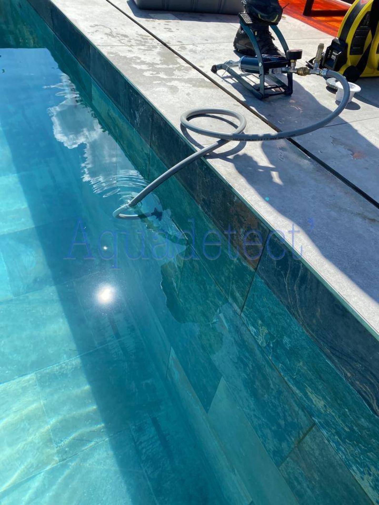 La société AQUA DETECT' a effectué une recherche de fuite piscine non destructive, le bassin perdait environ 10 cm d’eau par jour, la recherche de fuite c'est effectuée de la manière suivante : Passage en fluorescéine sur chaque traversée de parties, démontage du collecteur dans local technique, p...